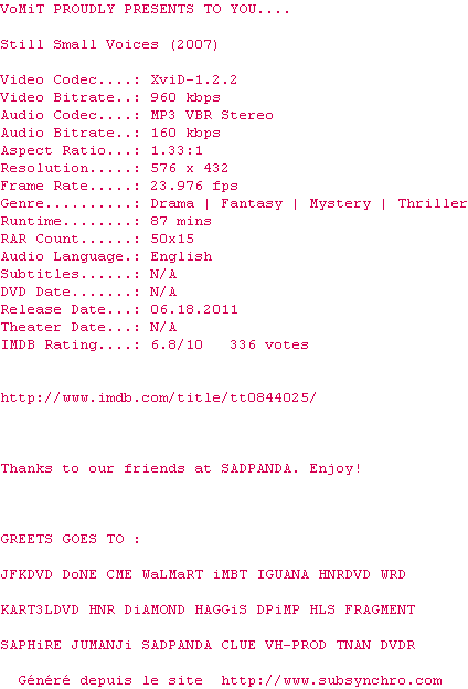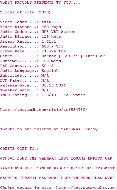 Voir le nfo de la release Slices.Of.Life.2010.DVDRip.XviD-VoMiT