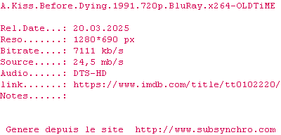 Voir le nfo de la release A.Kiss.Before.Dying.1991.720p.BluRay.x264-OLDTiME