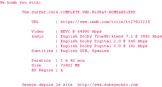 Voir le nfo de la release The.Surfer.2024.1080p.Blu-ray.Remux.AVC.TrueHD.7.1-HDT