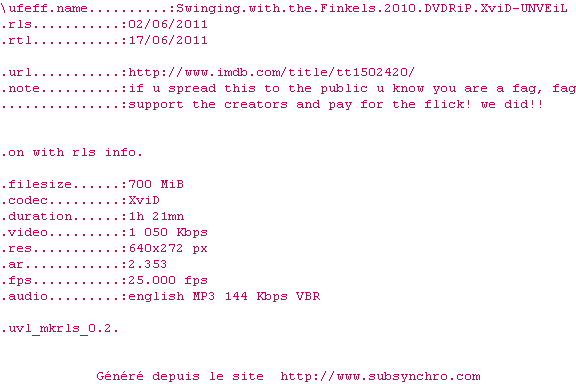 Voir le nfo de la release Swinging.with.the.Finkels.2010.DVDRiP.XviD-UNVEiL