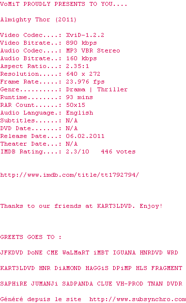 Voir le nfo de la release Almighty.Thor.2011.DVDRip.XviD-VoMiT