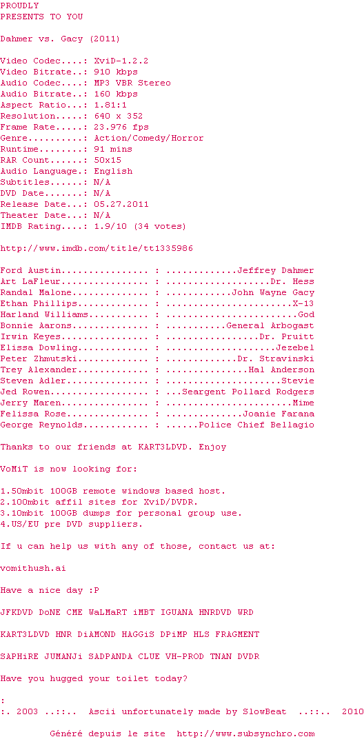 Voir le nfo de la release Dahmer.Vs.Gacy.2011.DVDRip.XviD-VoMiT