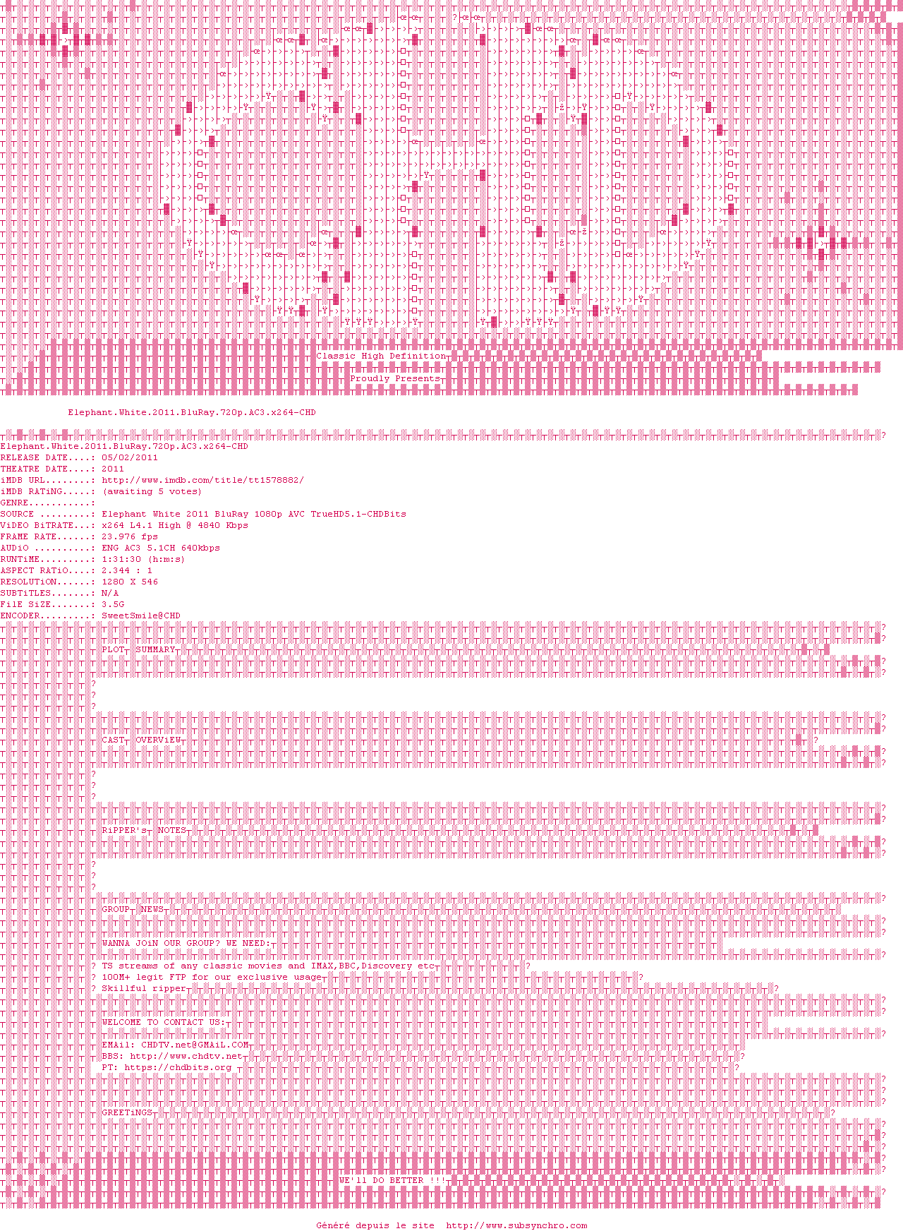 Voir le nfo de la release Elephant.White.2011.BluRay.720p.AC3.x264-CHD