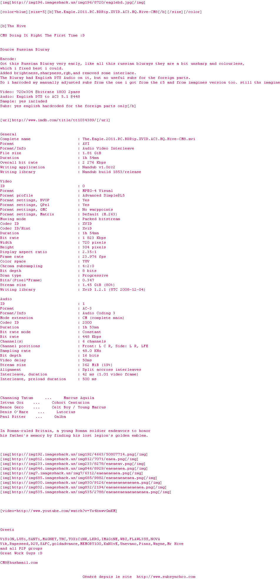 Voir le nfo de la release The.Eagle.2011.RC.BDRip.XVID.AC3.HQ.Hive-CM8