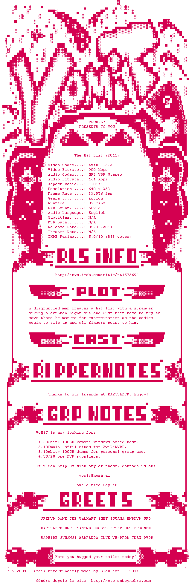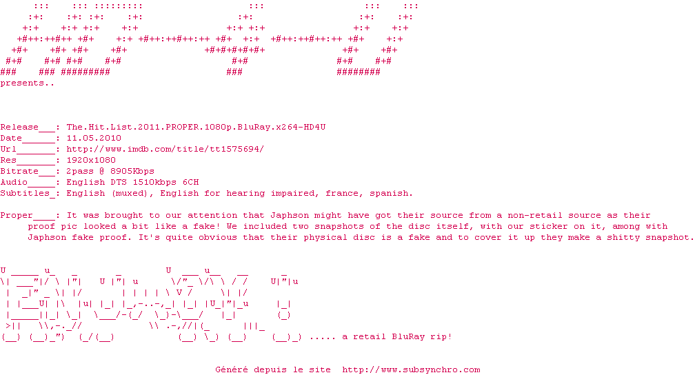 Voir le nfo de la release Armadillo.2010.MULTi.1080p.BluRay.x264-FHD