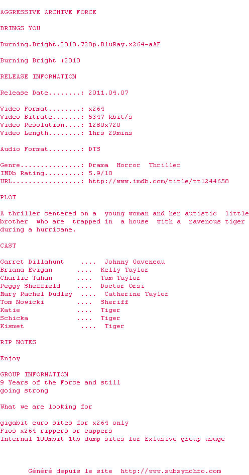 Voir le nfo de la release Burning.Bright.2010.720p.BluRay.x264-aAF