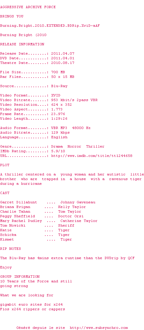 Voir le nfo de la release Burning.Bright.2010.EXTENDED.BDRip.XviD-aAF