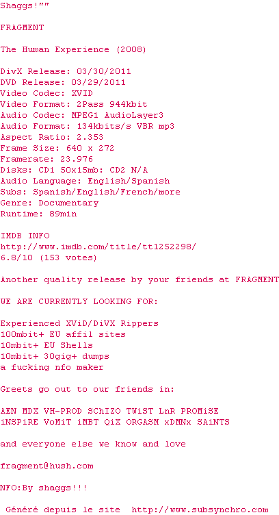Voir le nfo de la release The.Human.Experience.2008.DVDRip.XviD-FRAGMENT