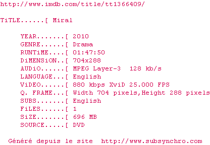 Voir le nfo de la release Miral.2011.DVDRiP.XviD-DVDFR