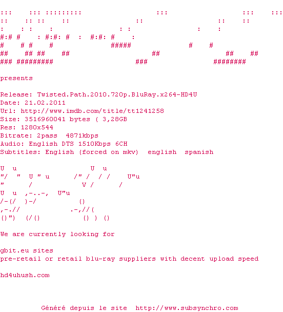 Voir le nfo de la release Twisted.Path.2010.720p.BluRay.x264-HD4U