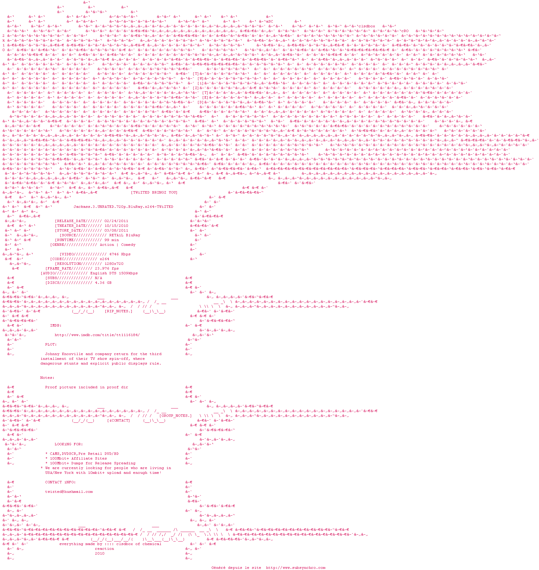 Voir le nfo de la release Jackass.3.UNRATED.720p.BluRay.x264-TWiZTED