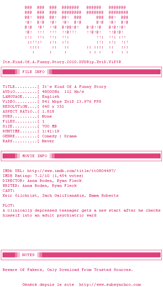 Voir le nfo de la release Its.Kind.Of.A.Funny.Story.2010.DVDRip.XviD-ViP3R