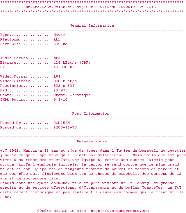 Voir le nfo de la release Un.Ete.Sans.Point.Ni.Coup.Sur.STV.FRENCH.DVDRiP.XViD-STS