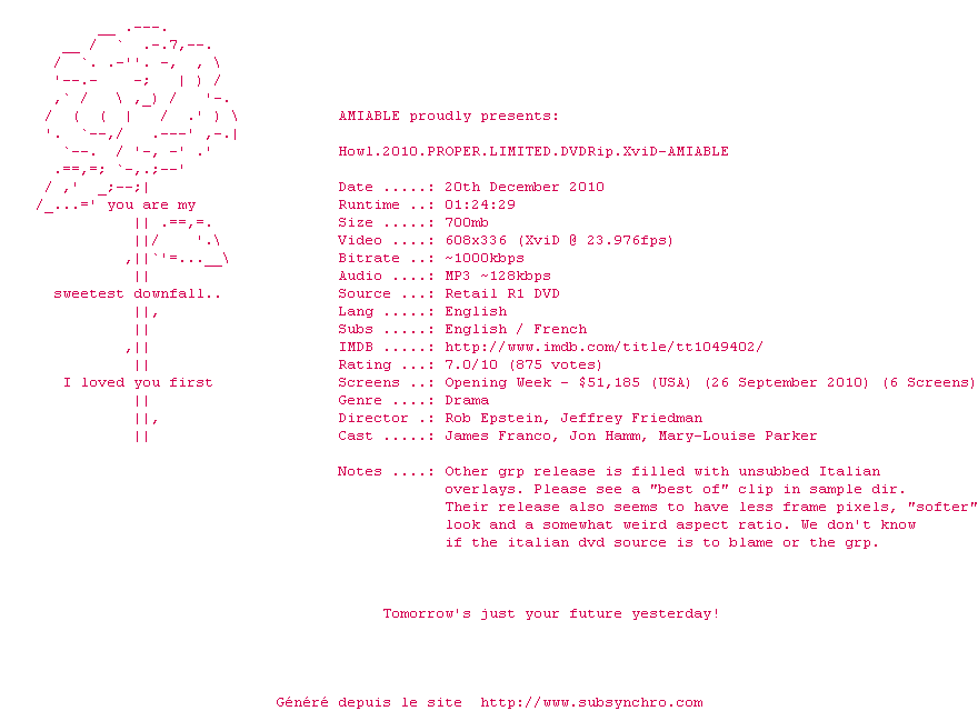 Voir le nfo de la release Howl.2010.PROPER.LIMITED.DVDRip.XviD-AMIABLE