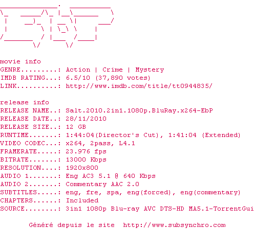 Voir le nfo de la release Salt.2010.DC.MULTi.1080p.BluRay.x264-THENiGHTMAREiNHD