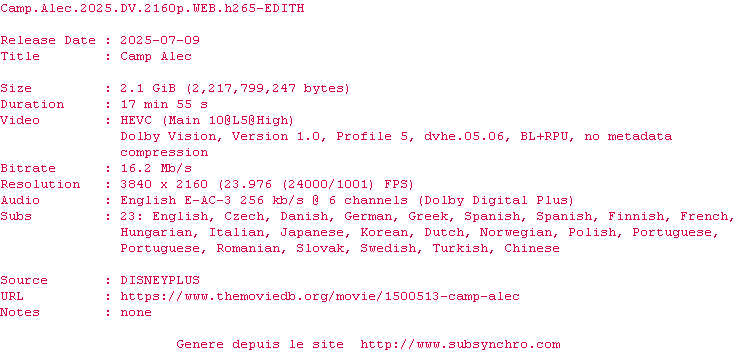 Voir le nfo de la release Camp.Alec.2025.DV.2160p.WEB.H265-EDITH