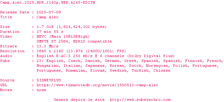 Voir le nfo de la release Camp.Alec.2025.HDR.2160p.WEB.H265-EDITH