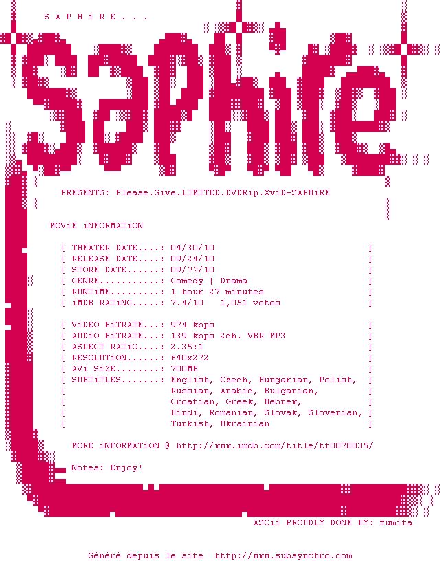 Voir le nfo de la release Please.Give.LIMITED.DVDRip.XviD-SAPHiRE