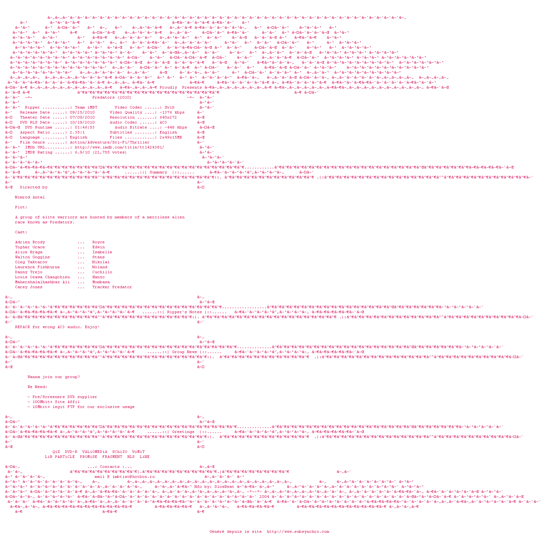 Voir le nfo de la release Predators.2010.REPACK.BDRip.XviD-iMBT