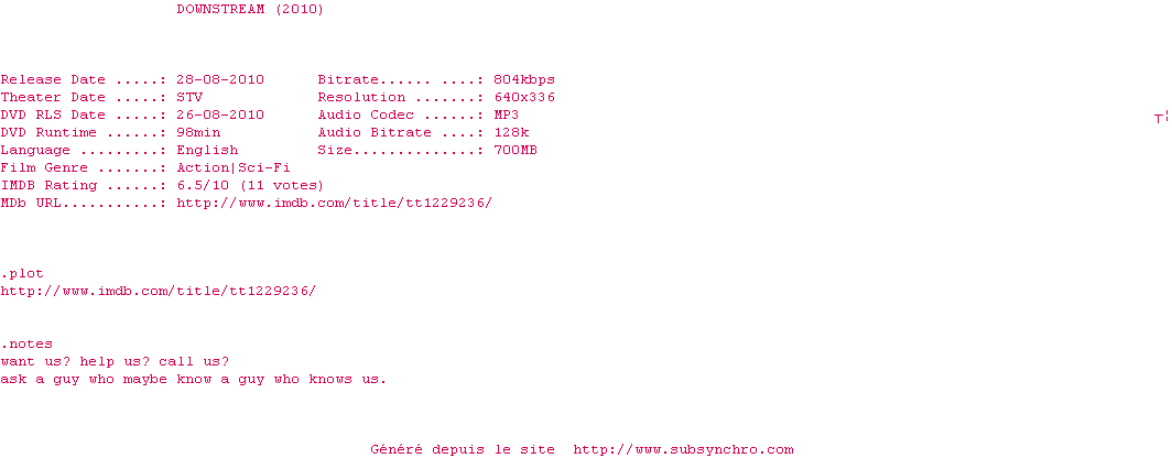 Voir le nfo de la release Downstream.2010.BDRip.XviD-BRiGHT