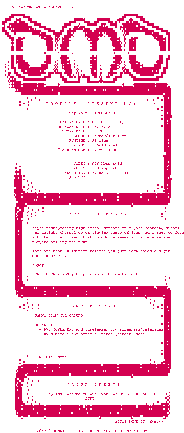 Voir le nfo de la release Cry.Wolf.WS.DVDRip.XviD-DiAMOND
