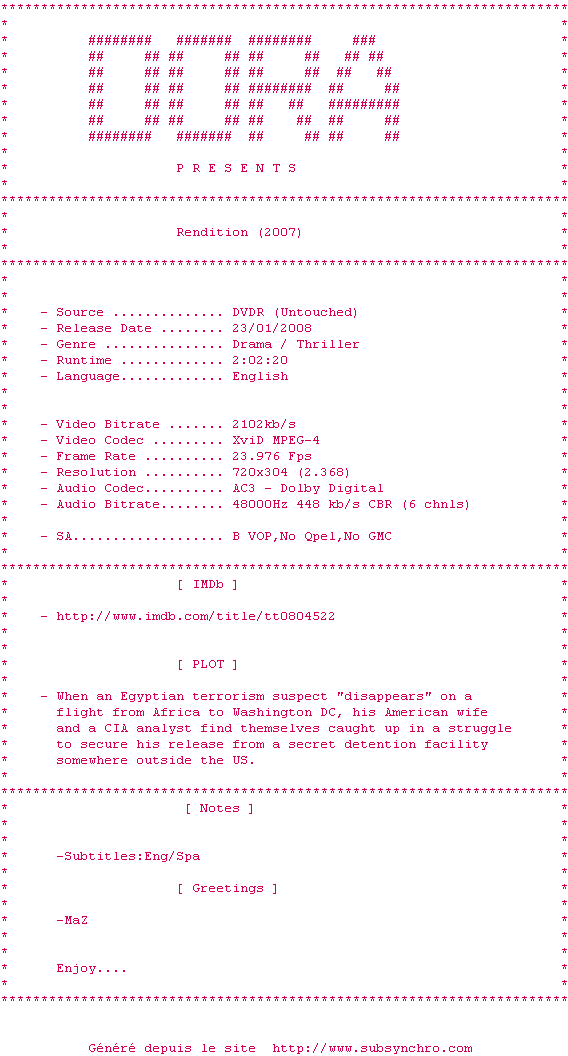 Voir le nfo de la release Rendition.2007.DVDRip.XviD.AC3-DORA