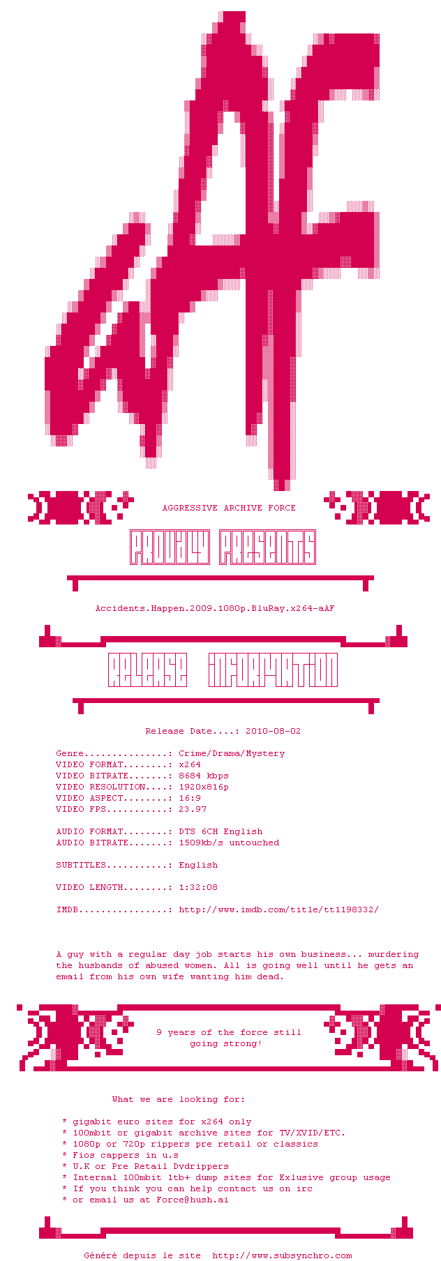 Voir le nfo de la release Accidents.Happen.2009.BDRip.XviD-FRAGMENT