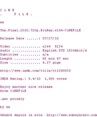 Voir le nfo de la release The.Final.2010.720p.BluRay.x264-CiNEFiLE