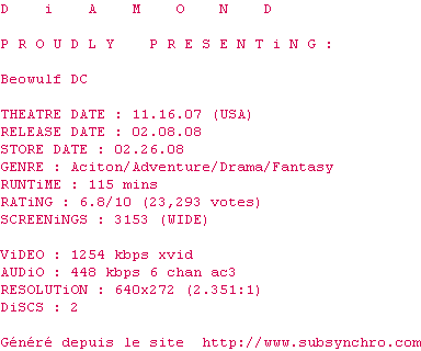 Voir le nfo de la release Beowulf.2007.DC.DVDRip.XviD-DiAMOND