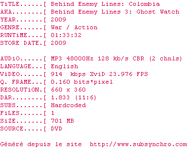 Voir le nfo de la release Behind.Enemy.Lines-Colombia.2009.DVDRip-aXXo