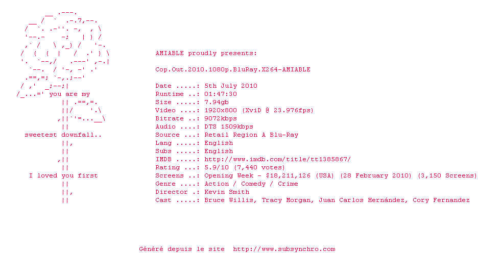 Voir le nfo de la release Cop.Out.2010.1080p.BluRay.X264-AMIABLE