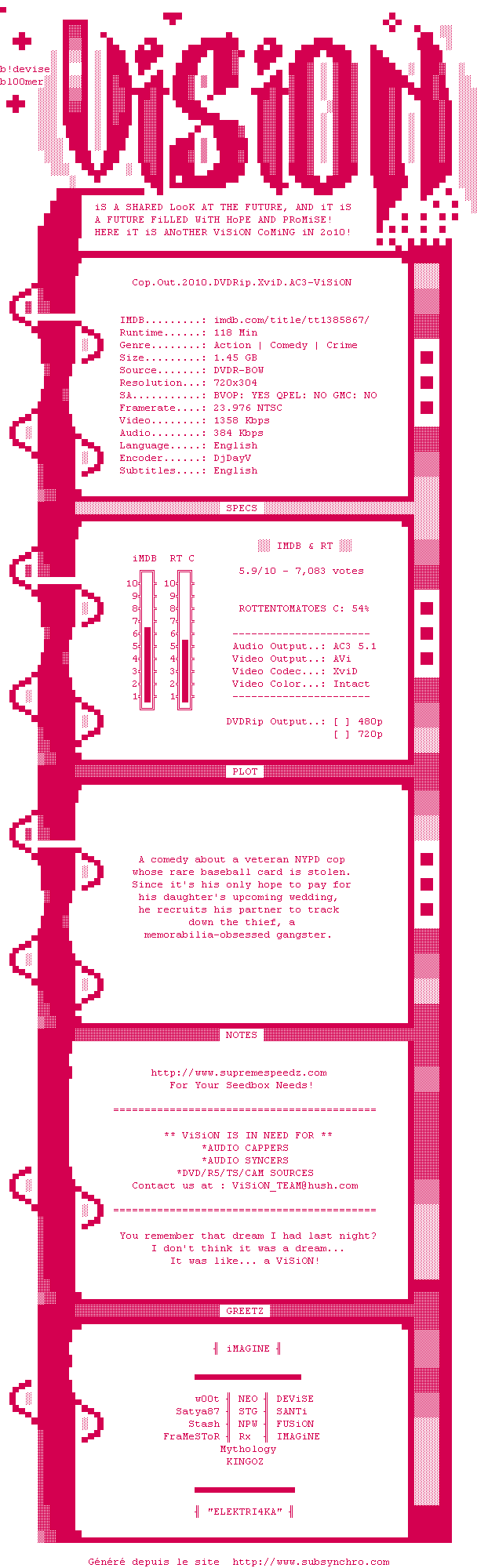 Voir le nfo de la release Cop.Out.2010.DVDRip.XviD.AC3-ViSiON