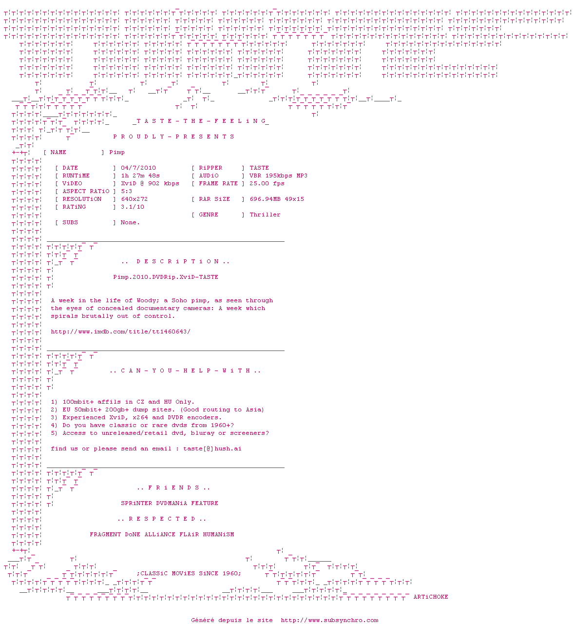 Voir le nfo de la release Pimp.2010.DVDRip.XviD-TASTE