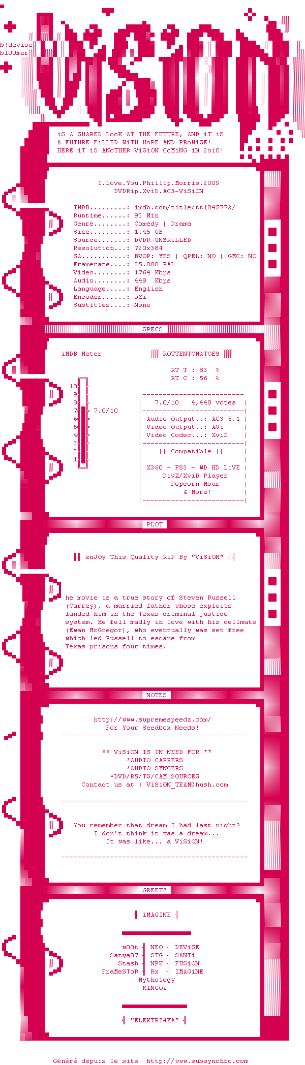 Voir le nfo de la release I.Love.You.Phillip.Morris.2009.DVDRip.XviD-DUBBY
