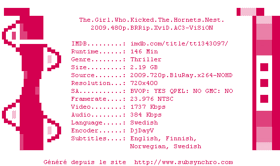 Voir le nfo de la release The.Girl.Who.Kicked.The.Hornets.Nest.2009.480p.BRRip.XviD.AC3-ViSiON
