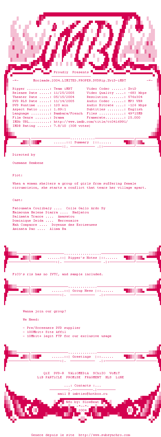 Voir le nfo de la release Moolaade.2004.Limited.PROPER.DVDRip.XviD-iMBT