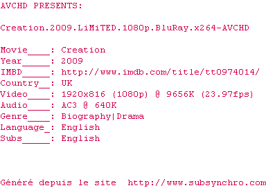 Voir le nfo de la release Creation.2009.LiMiTED.1080p.BluRay.x264-AVCHD