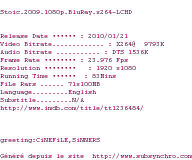 Voir le nfo de la release Stoic.2009.1080p.BluRay.x264-LCHD