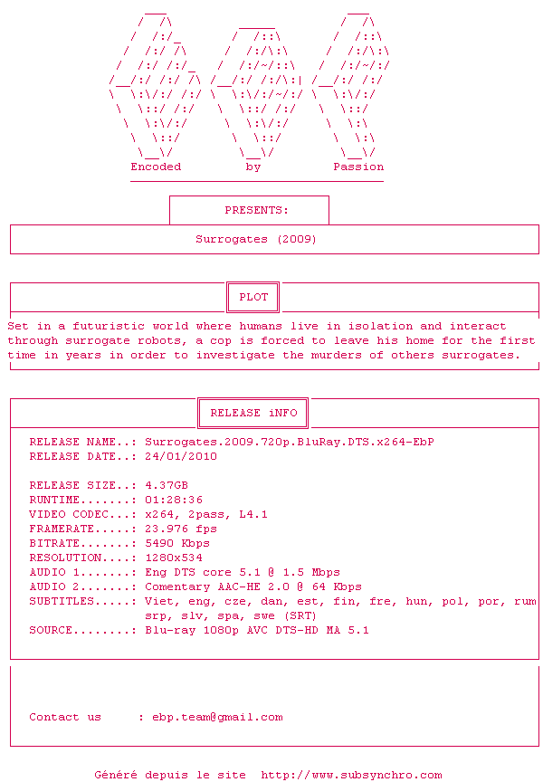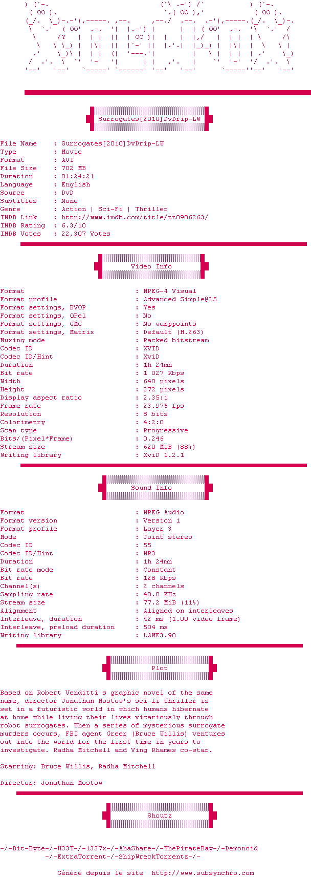 Voir le nfo de la release Surrogates.2010.DvDrip-LW