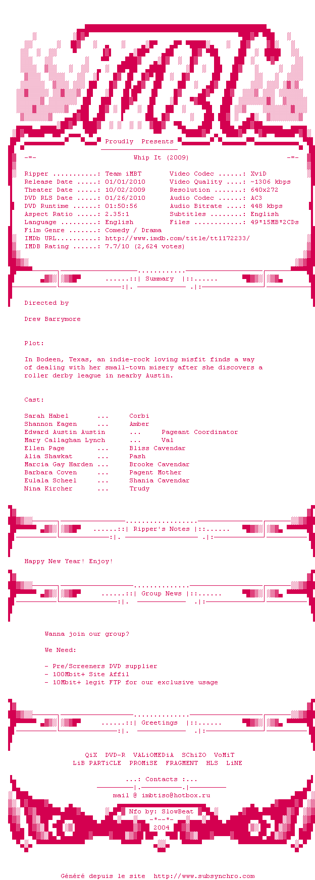 Voir le nfo de la release Whip.It.2009.BDRip.XviD-iMBT