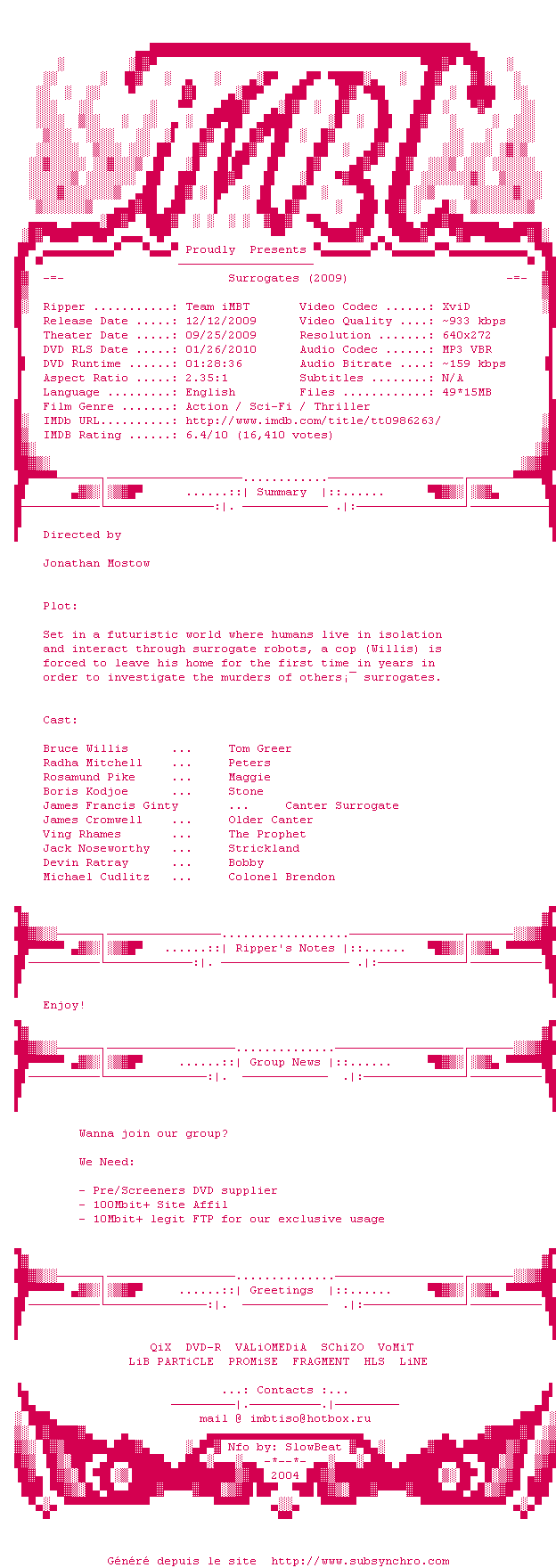 Voir le nfo de la release District.9.2009.PROPER.720p.BluRay.x264-FLHD