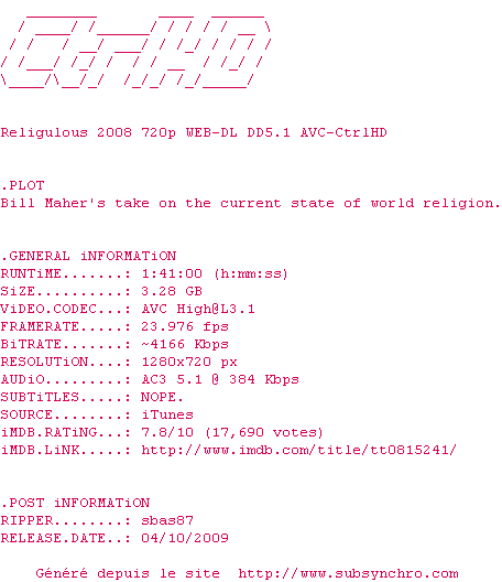Voir le nfo de la release Religulous.2008.720p.WEB-DL.DD5.1.AVC-CtrlHD