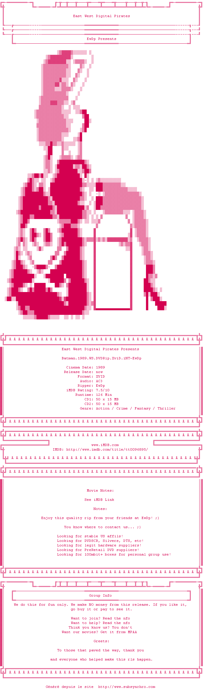 Voir le nfo de la release Batman.1989.WS.DVDRip.XviD.iNT-EwDp