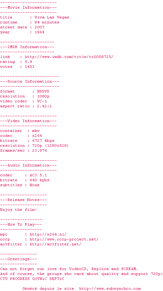 Voir le nfo de la release Viva.Las.Vegas.1964.720p.HDDVD.x264-REVEiLLE