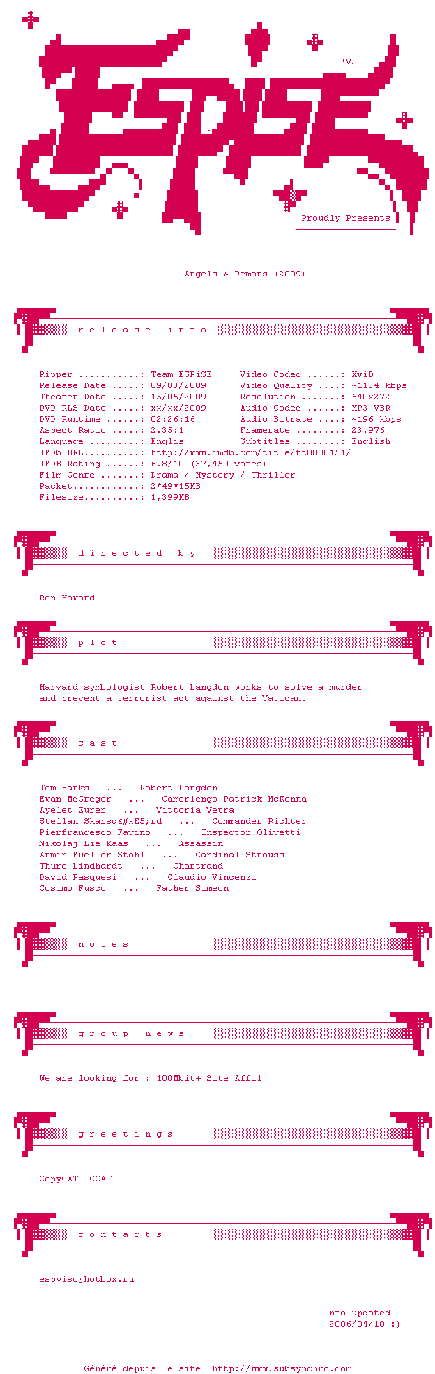 Voir le nfo de la release Angels.And.Demons.2009.Extended.Cut.BRRip.XviD.AC3-CiNEMA