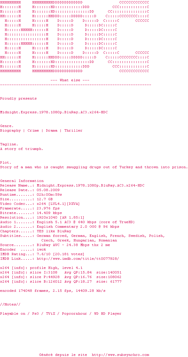 Voir le nfo de la release Midnight.Express.1978.1080p.BluRay.AC3.x264-HDC