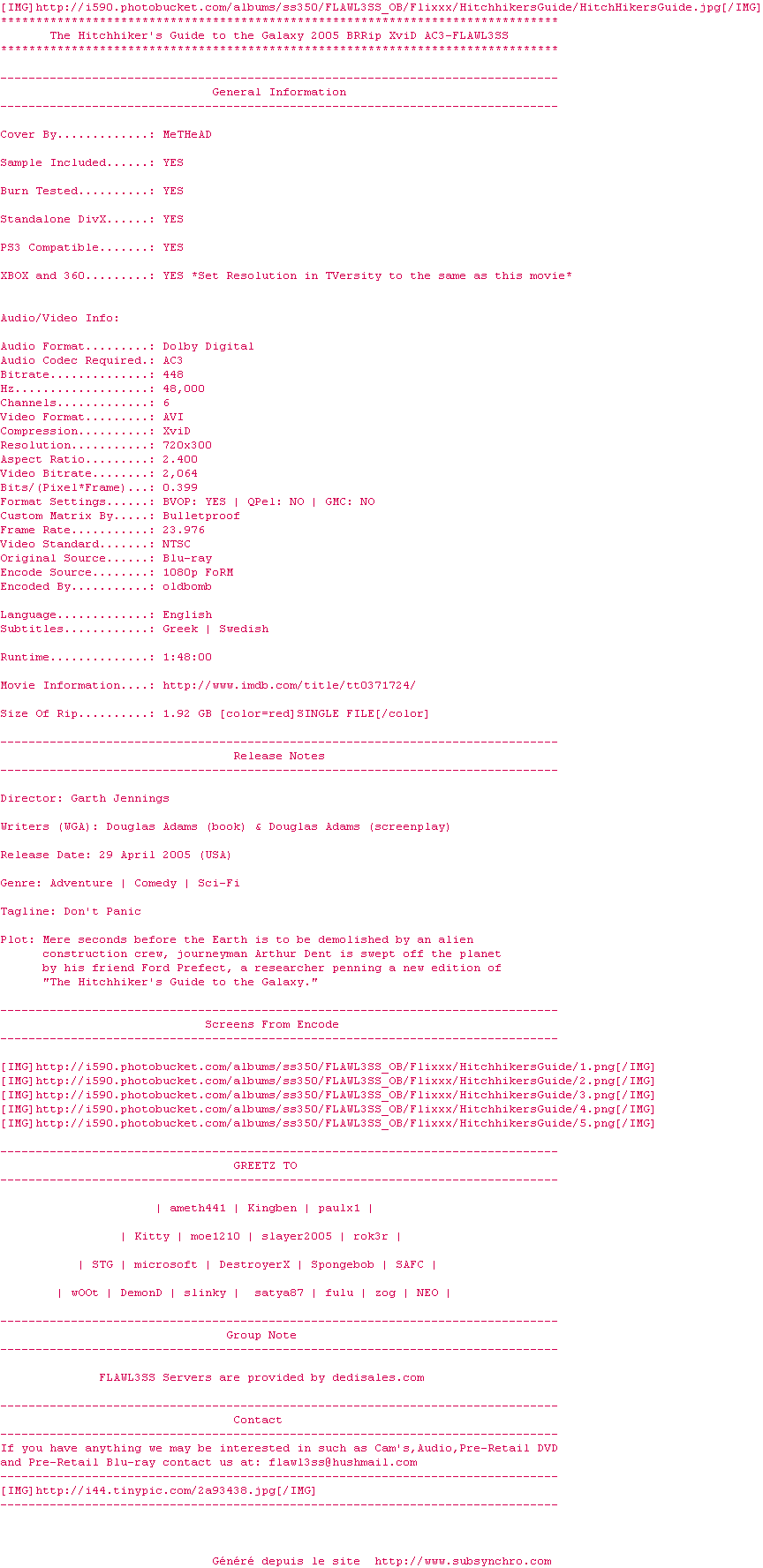 Voir le nfo de la release The.Hitchhikers.Guide.to.the.Galaxy.2005.BRRip.XviD.AC3-FLAWL3SS