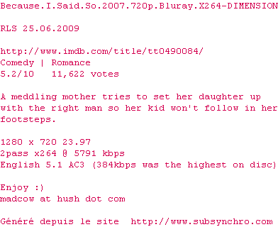 Voir le nfo de la release Because.I.Said.So.2007.720p.Bluray.X264-DIMENSION