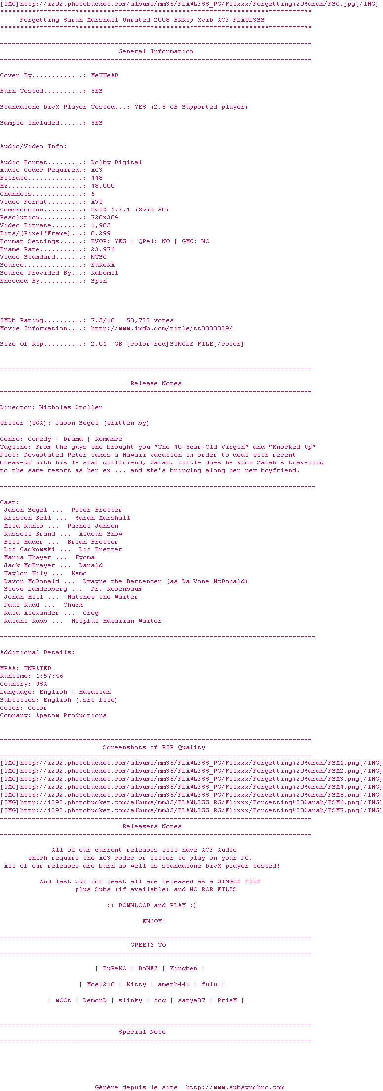 Voir le nfo de la release Forgetting.Sarah.Marshall.Unrated.2008.BRRip.XviD.AC3-FLAWL3SS
