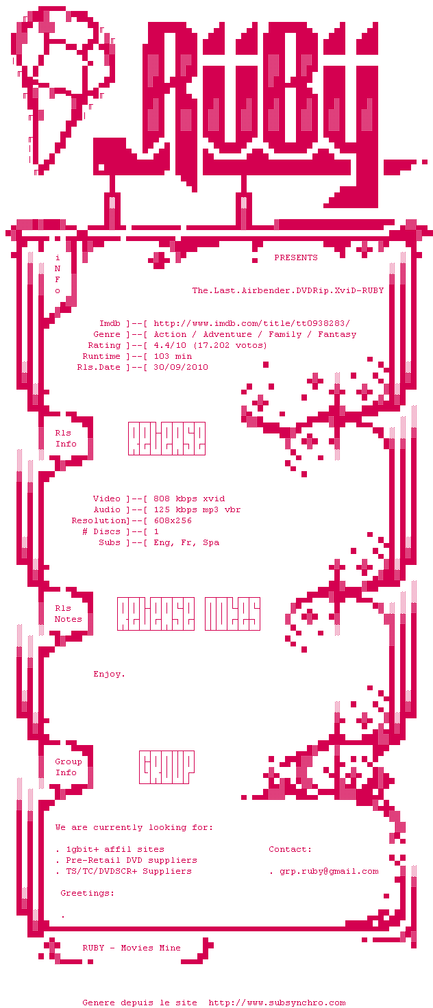 Voir le nfo de la release The.Last.Airbender.DVDRip.XviD-RUBY